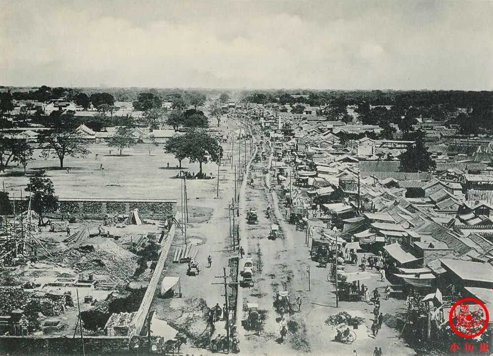 崇文门是税关,所有进入内城的货物都要经由此处纳税,因此崇文门大街最是热闹,从早到晚一派车水马龙的景象。不过,在列强的控制下,那种熙熙攘攘的景象没有出现,画面左侧还能看到战乱留下的废墟。