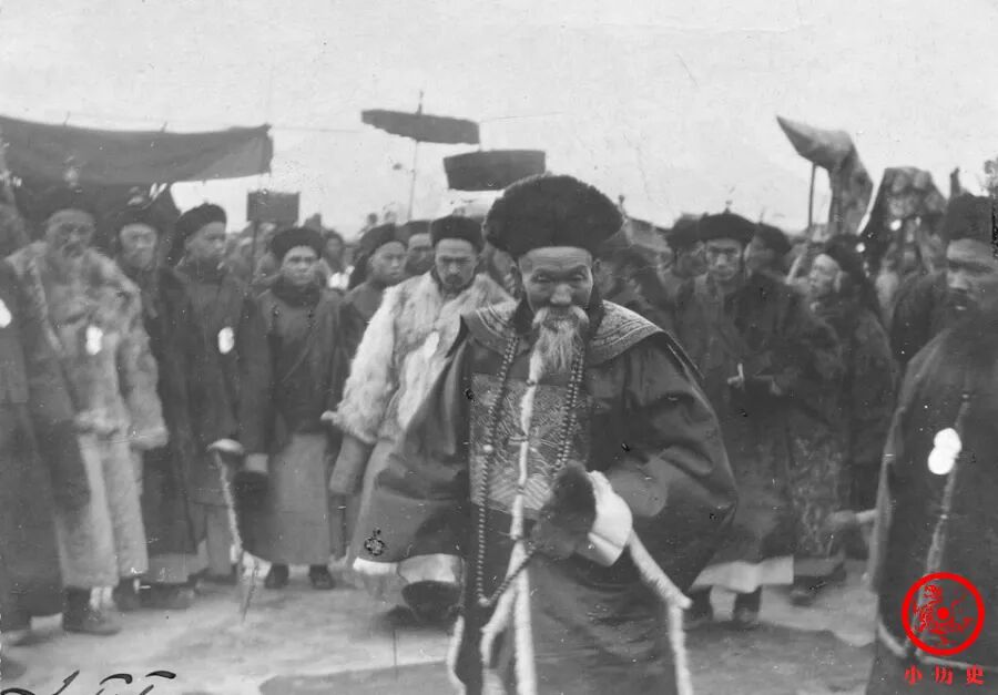 在某个户外活动场合,众多地方官员济济一堂。最前面这位身穿文官补服,表情严肃,走起路来神气十足、虎虎生威。因为所有人都不苟言笑,这张照片既有动感,也让人感到压抑。