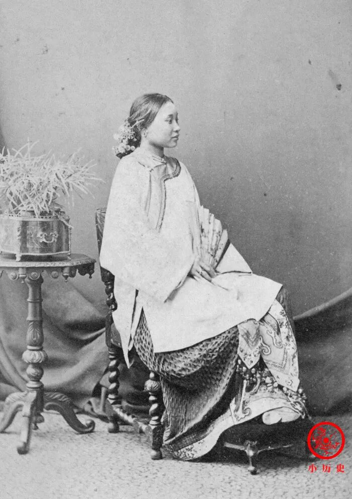 这名女子穿着华丽的服饰,坐在照相馆里拍照。她面容姣好,气质也不错,显然来自优渥的家庭。