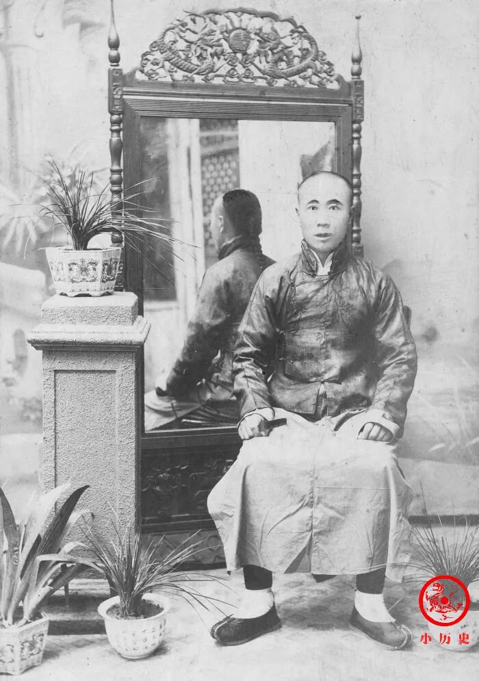 这是一张晚清时期经典的在照相馆内拍摄的人物肖像,男子正面对着镜头,又用镜子反射他的背面,如此一来全身上下、前后都被记录下来。摄影术在中国发展初期,很多人的摄影观念还停留在古代人物画阶段,就是拍照一定要尽量完整,尤其不能拍半身照,如同被砍了一样。