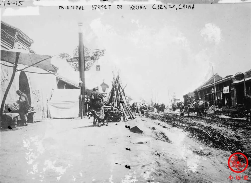 根据照片上方的英语标注,你能认出此地是哪里吗?这种泥泞坑洼的街道,在当时的大城小镇普遍存在。即便在北京,柏油路、石板路也没有多少。