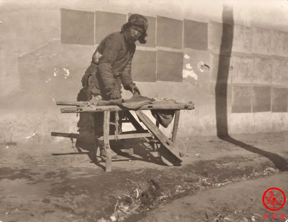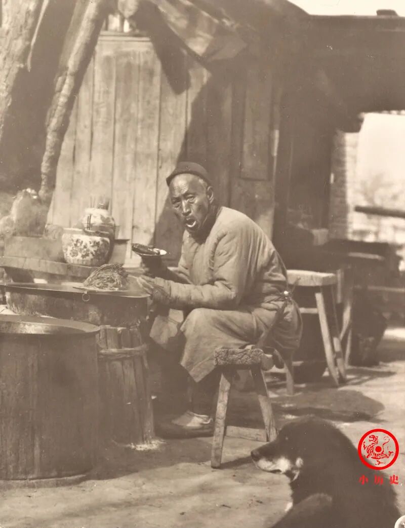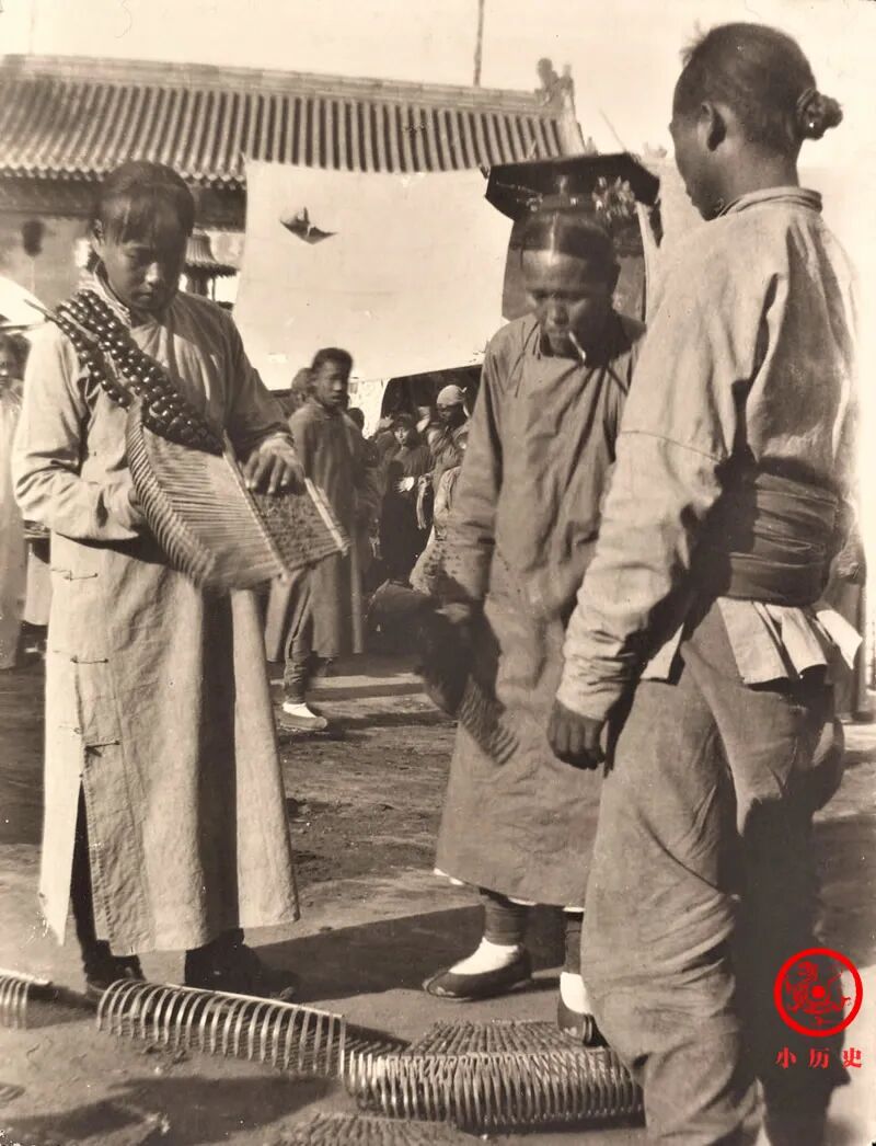 照片左二那位旗人妇女,叼着烟选商品,看上去特别有派头。此景是老北京充满烟火味道的一个画面。虽然城内聚集着各种权贵人物,但普通百姓才是绝大多数,他们在小摊上买卖物品、讨价还价才是生活的日常。