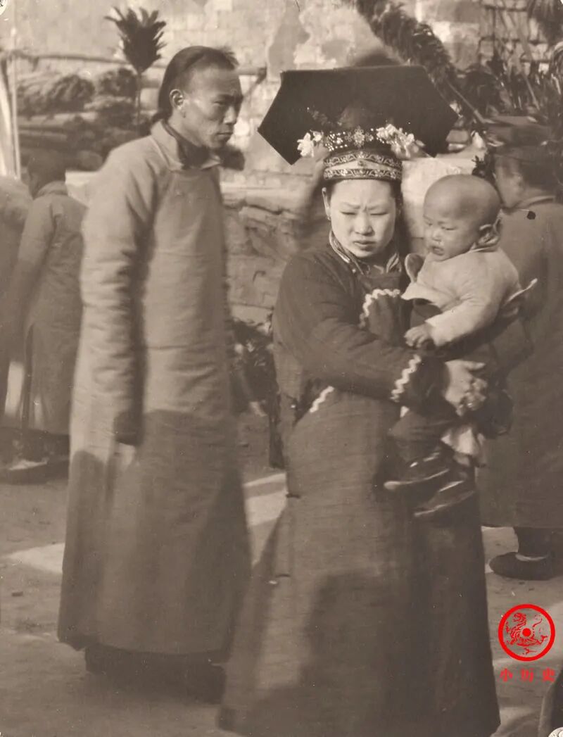 妈妈头戴大拉翅,表明了她的旗人身份。她怀里的孩子正在哭泣,是不是想要玩具、想要零食没有得逞?这个抓拍场景非常生活化。