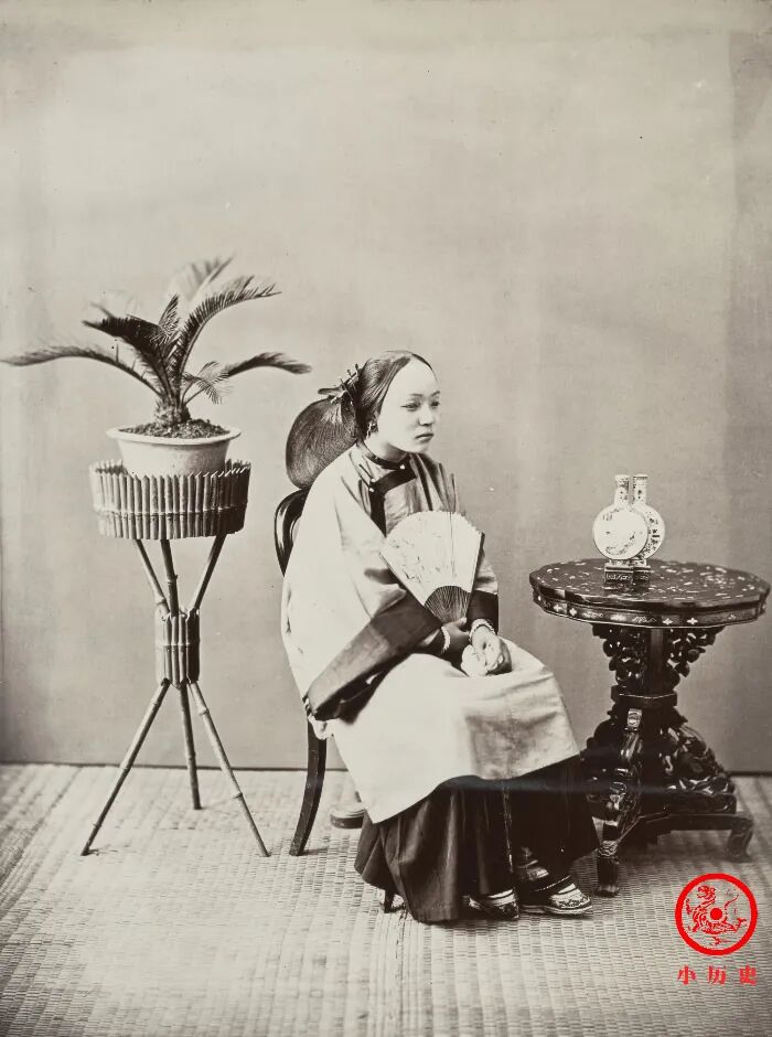 这位年轻女子穿着袄裙、裹着小脚、手持折扇和手绢,45度角对着镜头拍照,展现了最美的一面。她的发型略显夸张,犹如升起的船帆,因而得名“帆船髻”,流行于清朝中晚期东南沿海一带的妇女中。有学者认为,妇女通过梳“帆船髻”来表达对出海亲人的精神寄托,祈求平安。