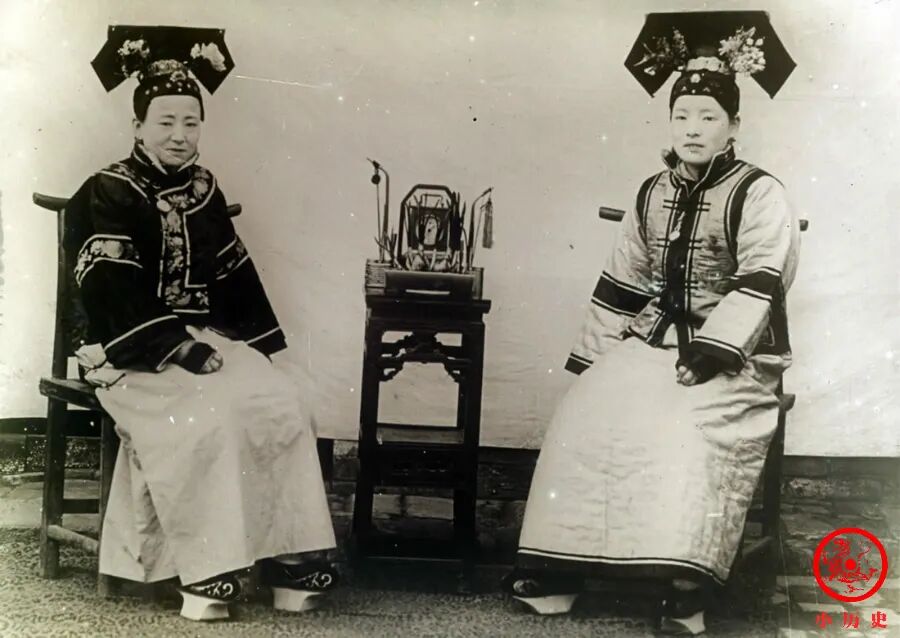 头上高耸的“大拉翅”、脚上厚厚的马蹄底鞋,是晚清旗人妇女的标志性装束。马蹄底鞋穿上并不舒适,走路也走不稳,一般只有中青年人穿,老年人穿上就行走困难了。