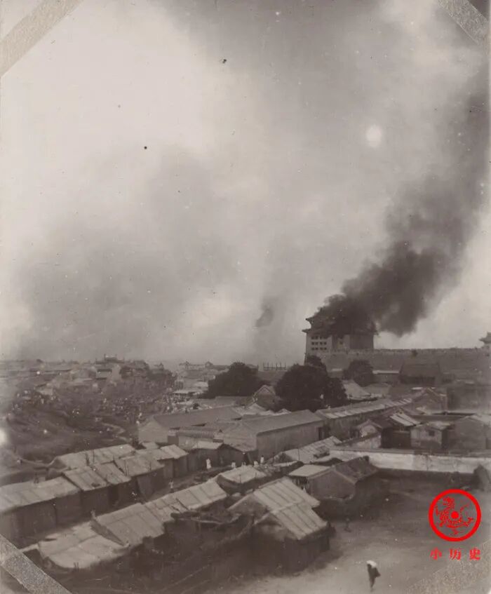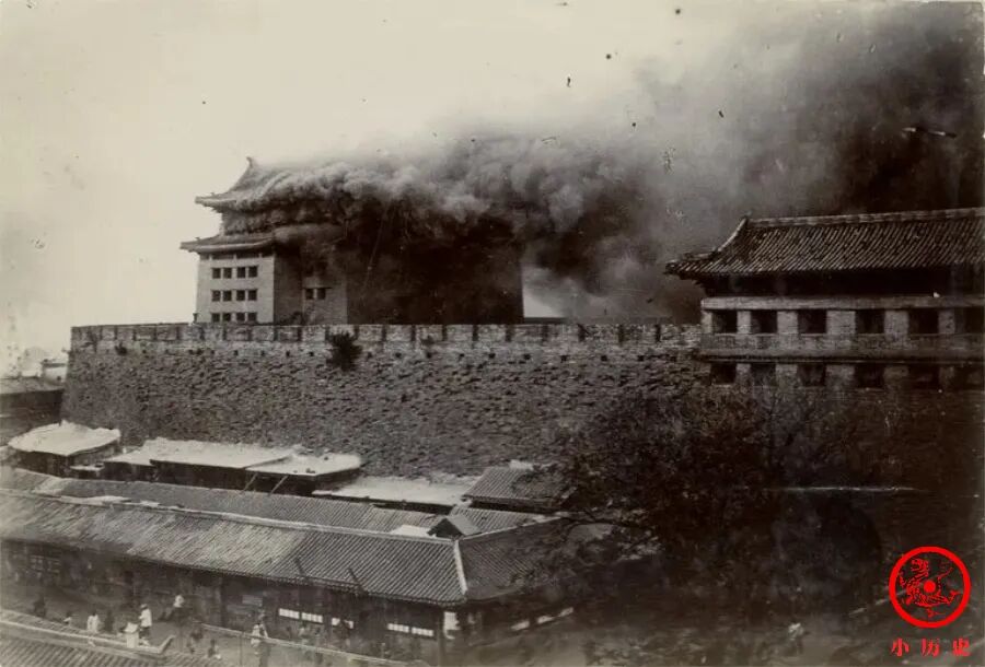 1900年6月16日,义和团为抵制洋货,火烧位于大栅栏的老德记洋货店,当时恰遇西南风,以致火势迅速蔓延,最终引燃前门箭楼。《庚子国变记》记载道:“(义和团)焚正阳门外四千余家,京师富商所集也,数百年精华尽矣。延及城阙,火光烛天,三日不灭。”当时有摄影师记录了这一幕,十分难得。