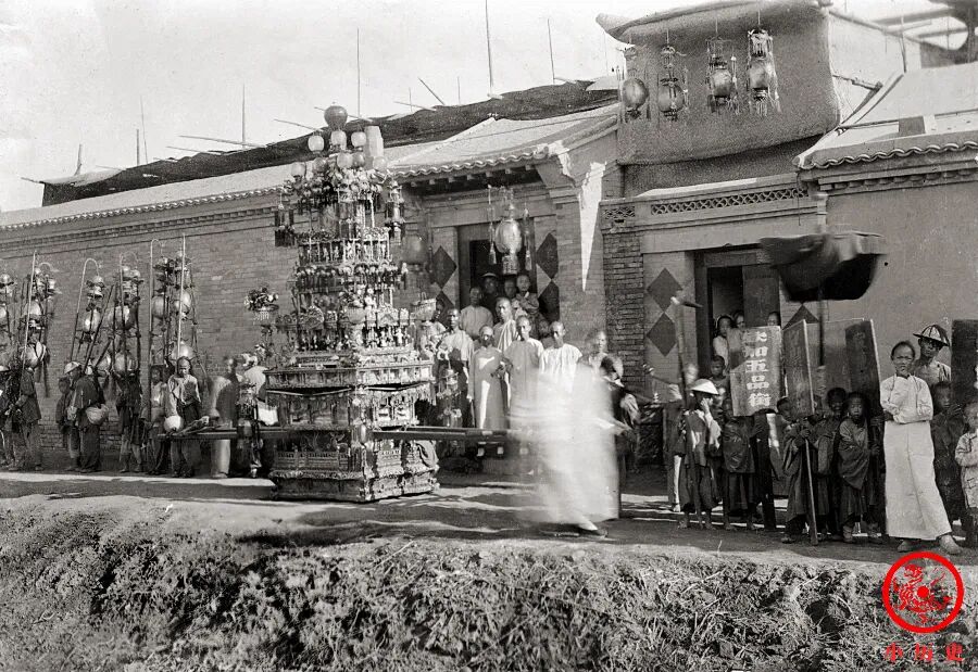 队列中有华盖,有灯笼,还有各式牌子,其中一个写着“钦加五品衔”,说明朝廷刚刚给某人封了五品官衔(不一定担任五品官职),照片中这些人在为他欢庆加官进爵。