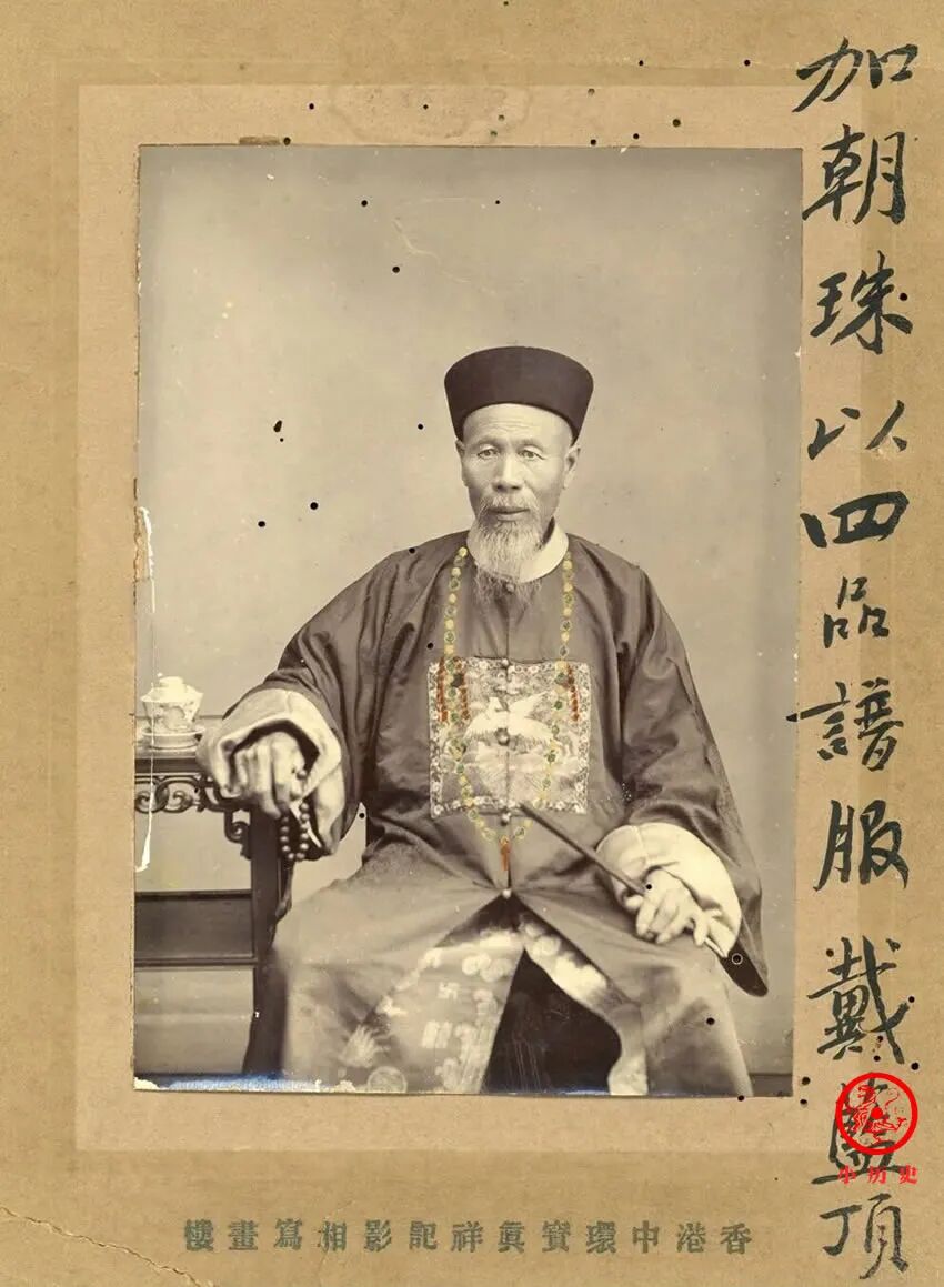 这张照片由宝真祥记照相馆拍摄,画面中的男子身穿朝服,左手执扇,右手捻珠,正襟危坐,表情严肃。右侧用毛笔写着“加朝珠以四品谱服戴蓝顶”,表明他是四品官的身份。