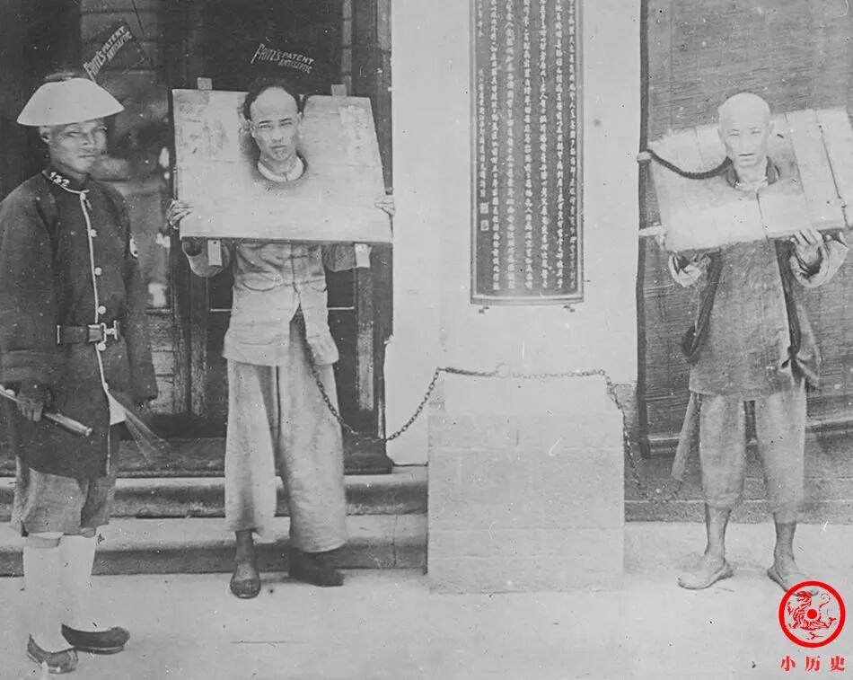 两个犯人被铁链拴在墙上,分别戴着枷板,像狗一样没有尊严。戴枷示众是一种不文明的刑罚。
