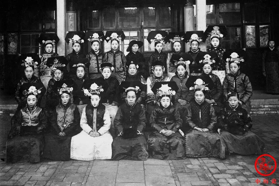 这些人衣着光鲜、头饰华丽,肯定来自官宦之家,甚至有来自王公之家的福晋、格格。最后一排中间那位女士一身西洋打扮,在整个画面中显得很另类。
