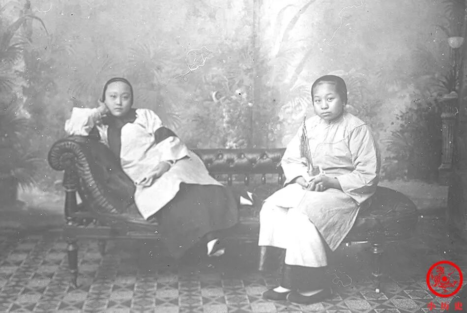 斜倚沙发的女士缠了小脚,而坐着的那位则是大脚,两人形成鲜明对比。清朝是中国历史上缠足风气最严重的时代,汉族妇女普遍将双脚缠成“三寸金莲”,以取悦男人,不裹脚的人会被当做异类。尽管如此,仍有少数女性坚持天足,躲过了一个大劫。