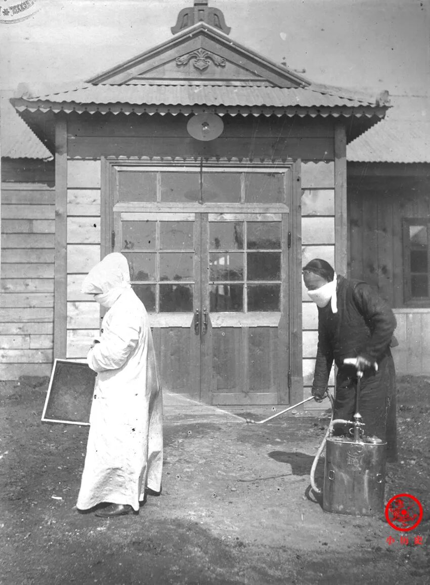 1910年底至1911年初,东北鼠疫期间的防护和消毒。