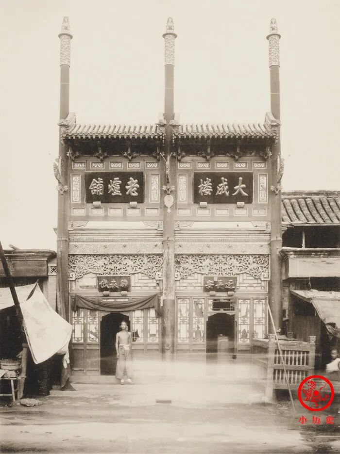 这家店铺位于北京东四牌楼附近,其冲天柱式门脸儿非常精美,也非常气派,从中可见店铺雄厚的实力。冲天柱又称通天柱,寄托着老板生意亨通、财气冲天的愿望。门脸儿本有彩绘,可惜黑白照片展示不出来,要不然更加好看。