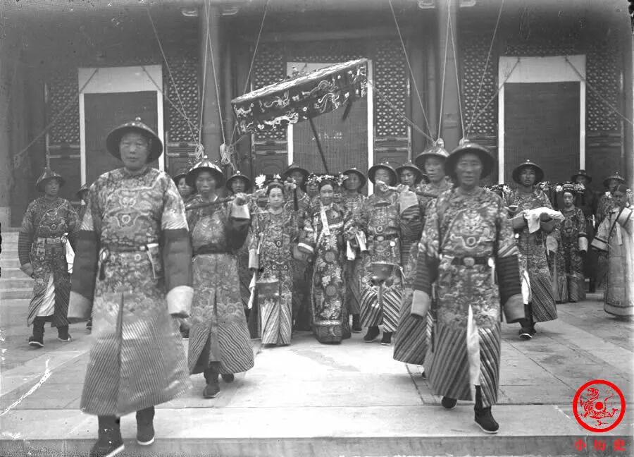 慈禧太后在太监、格格、福晋(这些人均身穿蟒袍,相当隆重)的簇拥下拍照,突显了她至高无上的地位。慈禧留下了很多照片,基本上都是绷着脸,面目严肃,但这一张与众不同,她脸上露出微笑的表情,这是难得一见的。