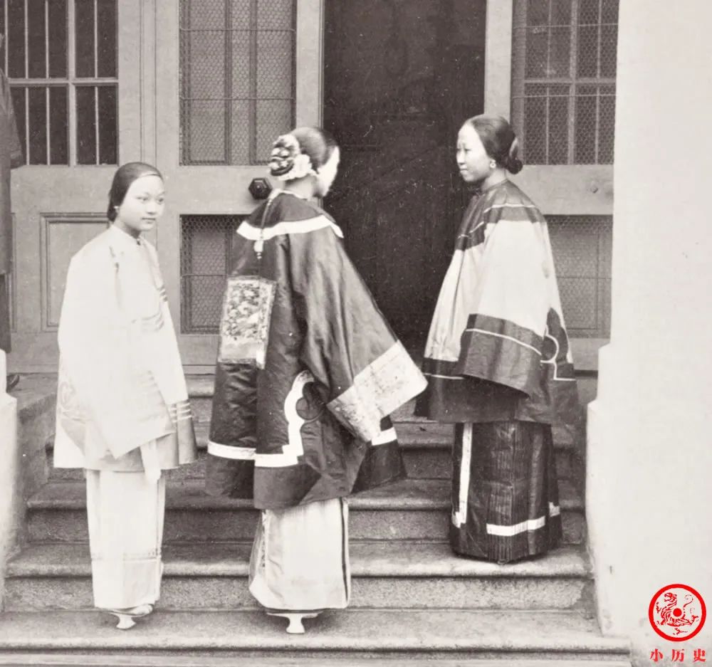 中间这位妇人穿着袄裙,袄子上绣有补子,说明她是朝廷册封过的诰命夫人。她这一套服装都是汉族风格,毫无疑问。奇怪的是,她脚上穿着只有八旗妇女才穿的马蹄底鞋。大家说说看,她到底是汉人还是旗人?或者是汉军旗人?