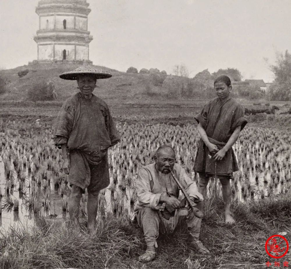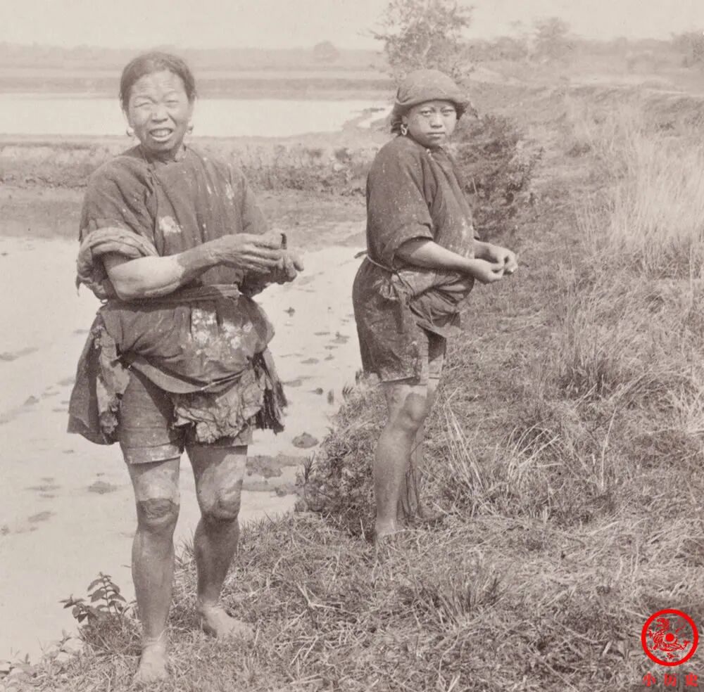 她们刚刚在稻田里干完农活,身上沾满淤泥。北方妇女大多裹小脚,很难像她们一样在农田劳作。