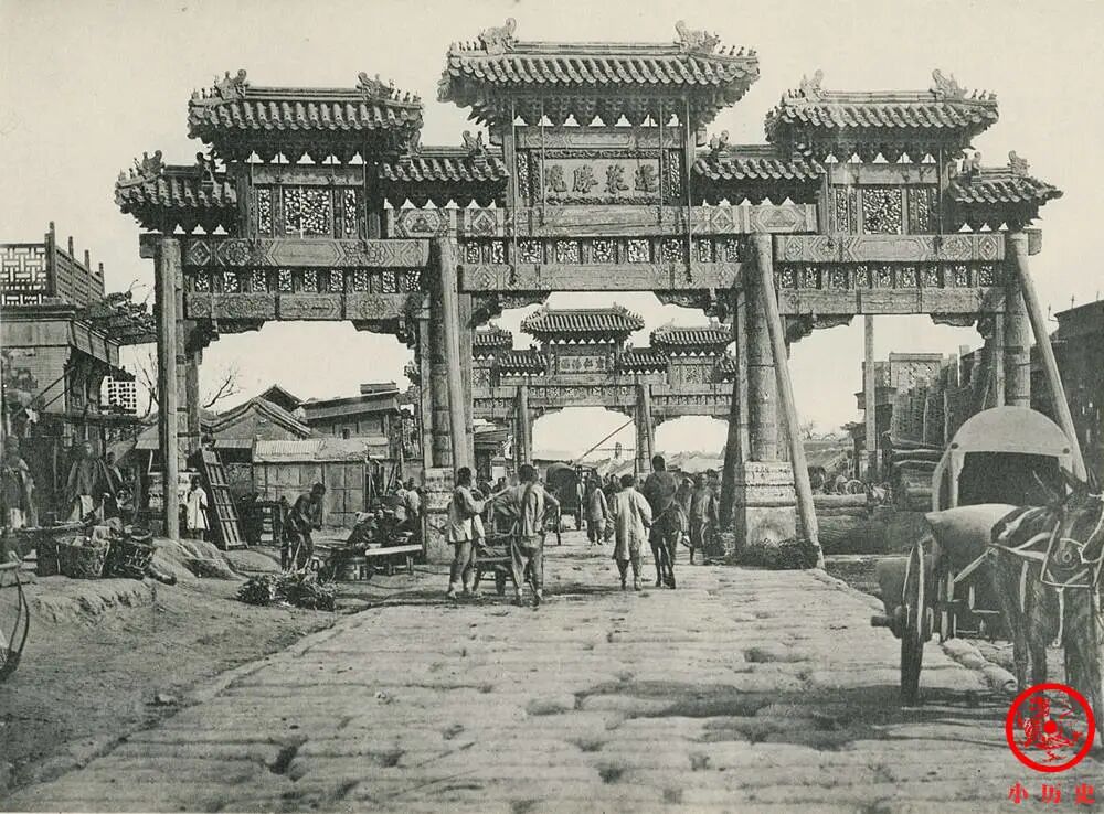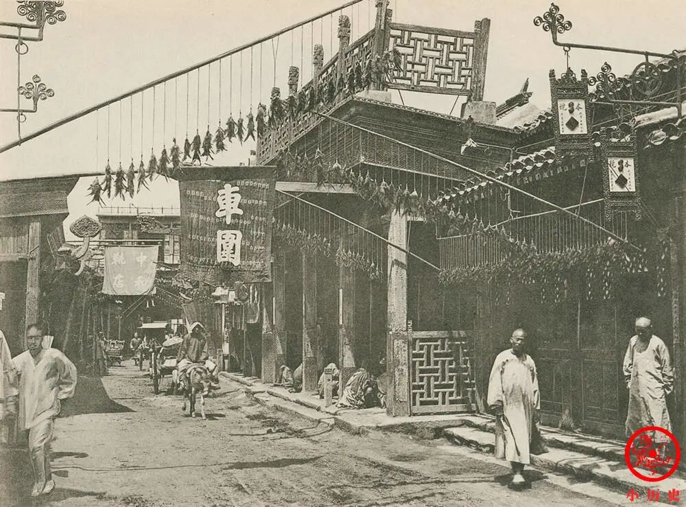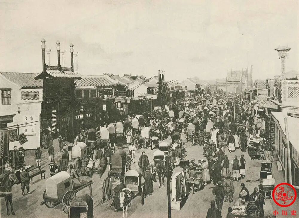 这是老北京最典型的街景,也是很多著名作家笔下描写过的场面。马车挤挤挨挨,已经造成了交通拥堵。左侧的店铺装修了牌楼,与铺面融为一体,那高高的冲天柱寄托着老板的希望:买卖兴隆,财气冲天。