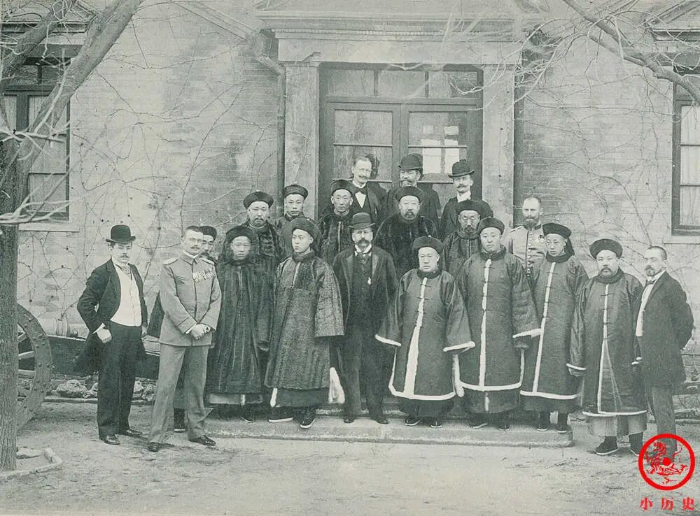 慈禧太后出逃后,命令善耆(前排右五)会同庆亲王奕劻、大学士李鸿章办理善后事宜。第二排右三是外务部侍郎那桐。照片中还出现了第二代醇亲王载沣,你能找到是哪一个吗?