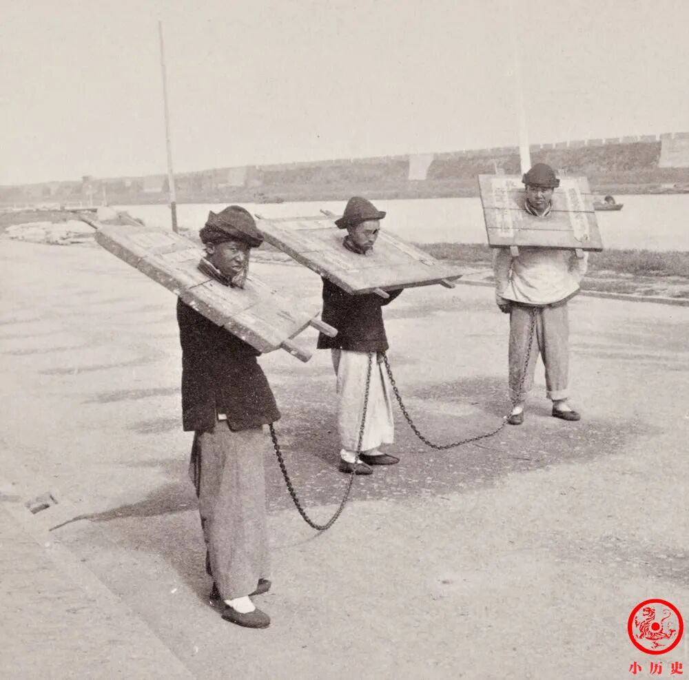 他们三人很可能是同一个案件的犯人,所以被铁链锁在了一起。沉重的枷板给他们带来很大的痛苦,吃喝拉撒都不方便。照片背景中可见古运河和苏州城墙。