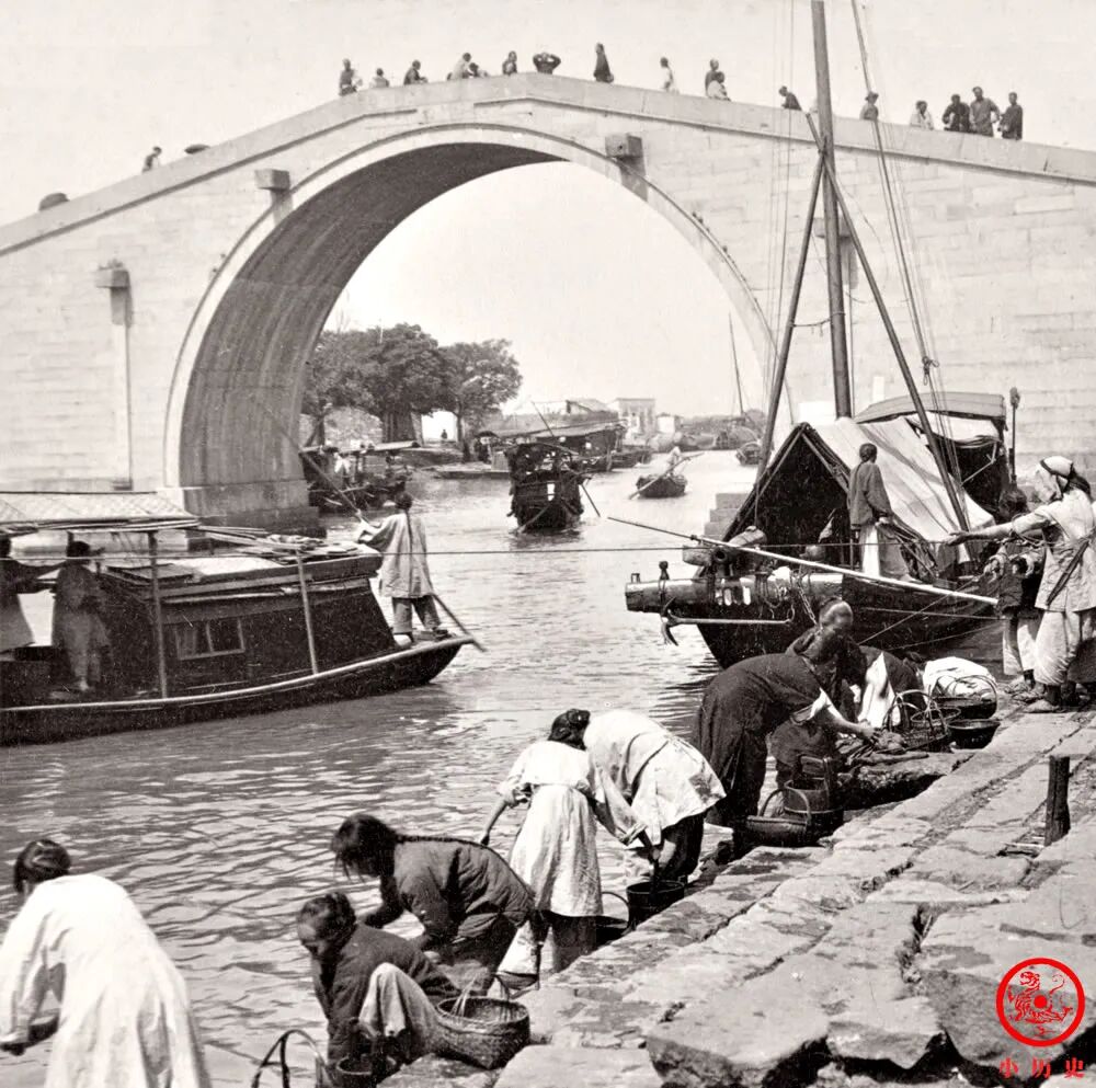 这是江南地区典型的“小桥流水”风光,很多妇女在河里洗涤。吴门桥位于苏州盘门外,横跨古运河(护城河),北宋初建清朝重修,至今仍存,已被列为全国重点文物保护单位。