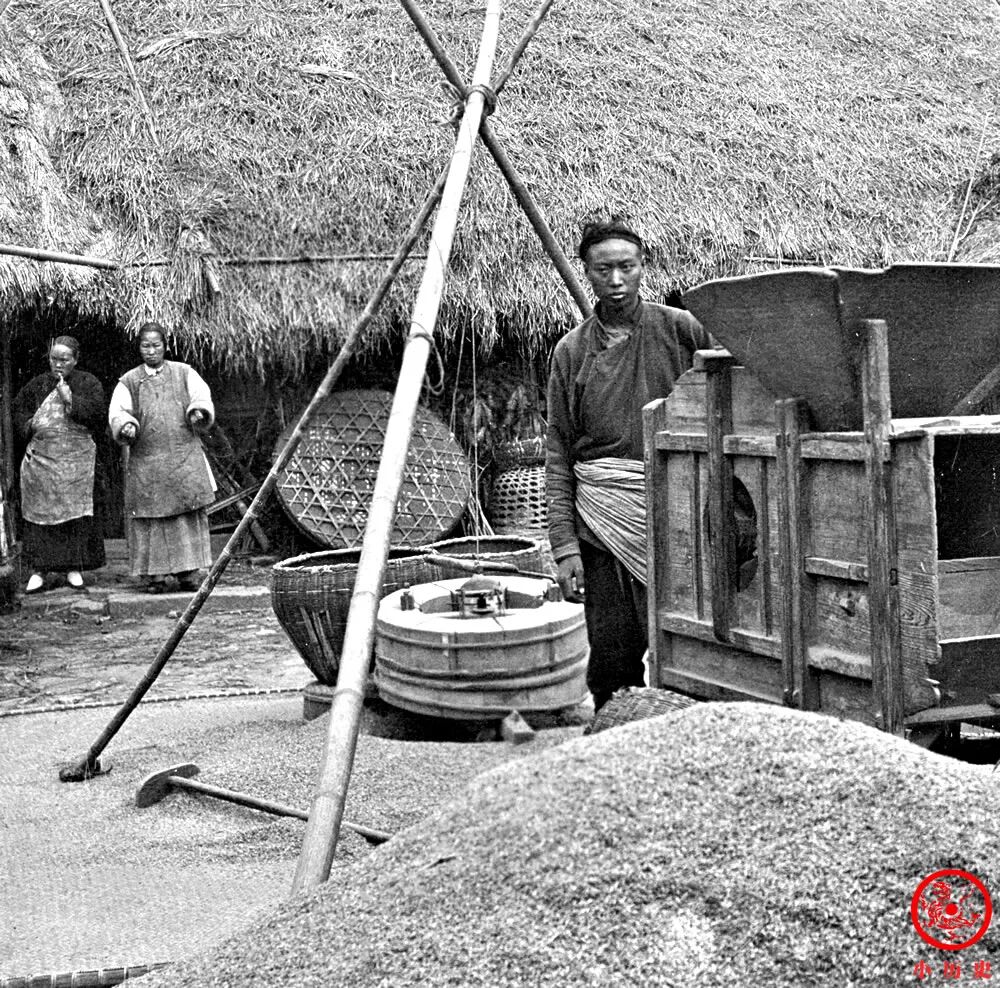 照片中,一个农民正在用传统的风谷机为稻谷脱粒,他将晒干的稻谷倒入进料口,摇动手柄,不一会儿饱满的谷粒就出来了。