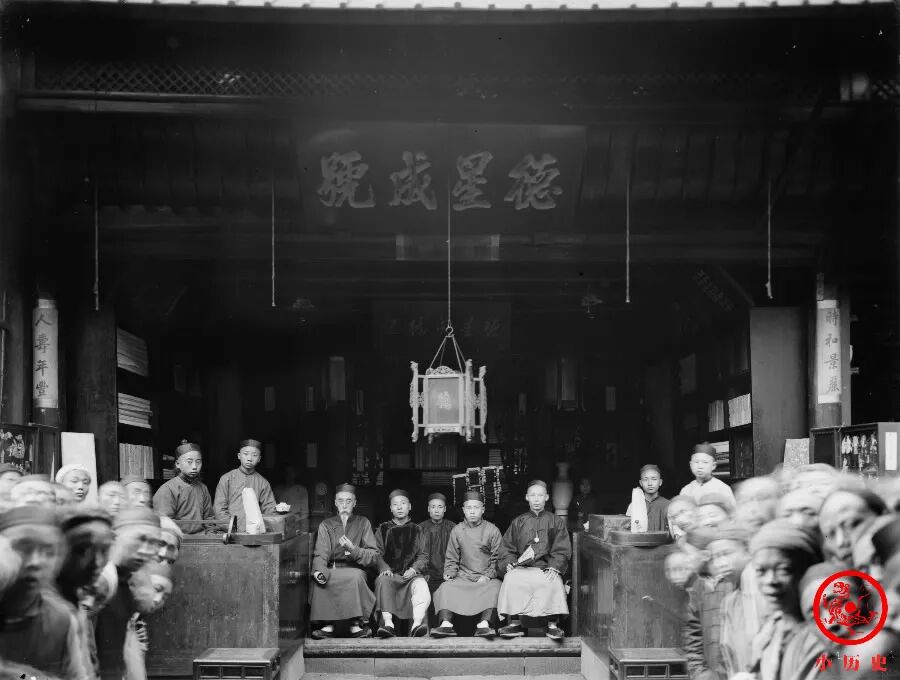 “德星成号”是嘉定府(今乐山)著名的商铺,以经营棉纱批发为主,另有房地产、银号等业务,同时在当地办了很多公益事业,如学校、修路、收养孤儿等。照片里坐着的人当中左一为“德星成号”最大的股东杨俊臣,因其家族财富雄厚,人称“杨半城”。