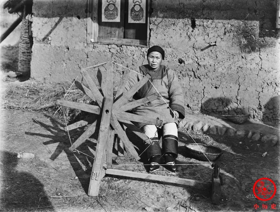 新年刚刚过去,这位妇女就在院子里摆开纺车,开始纺线,纺出足够多的棉线,才能织布。纺车是一种有2000多年历史的工具,晚清时期仍在农村大范围使用,但已经面临机器纺织业的冲击,其低效、低质的缺点日益暴露。