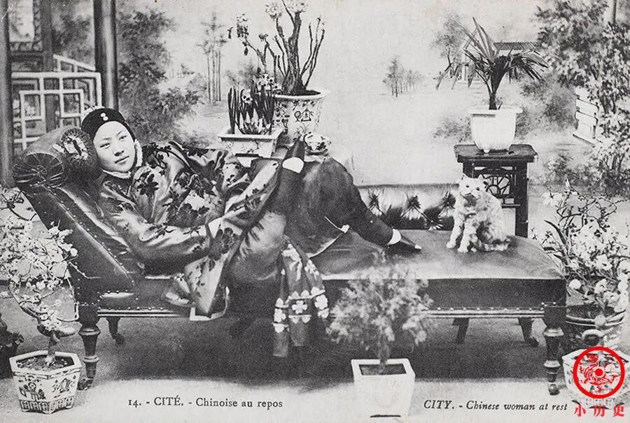 这是一位家境殷实的贵妇在照相馆的留影。她特意翘起了一只脚,展示自己的“三寸金莲”。在那个年代,小脚缠得又尖又纤细,是一件很骄傲的事。