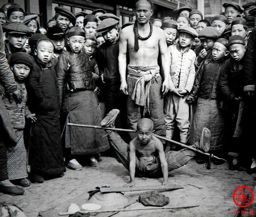 这个孩子看上去10岁左右,大冬天光着上身表演功夫,着实令人心酸。那时候卖艺、唱戏都是很低贱的行业,常常被人看不起,但是若非生活所迫,谁愿意干这一行呢?为了一口饭而已!