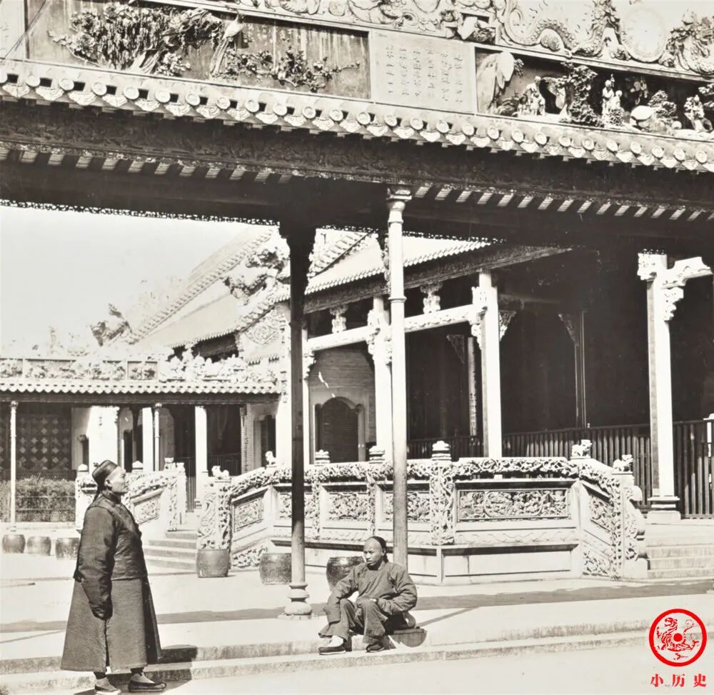 陈家祠堂于1894年落成,是广东规模最大、装饰华丽的传统岭南祠堂式建筑。从这张黑白照片中,我们也能看到护栏、房檐有着精细的雕刻。该祠堂至今保存完好,被誉为“广州文化名片”。