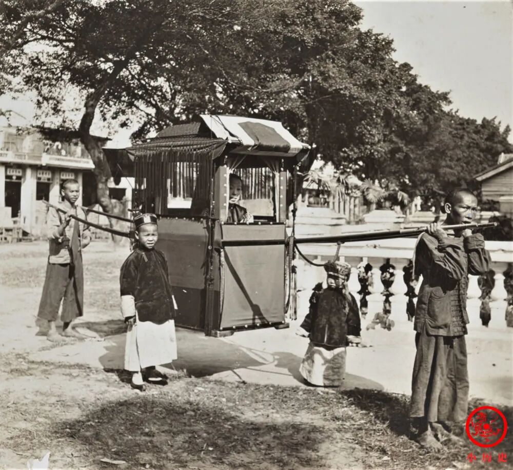 妇女坐在轿子里,旁边的孩子是她的儿女。普通人家雇不起轿夫,要有一定的经济实力才会选择坐轿出行。
