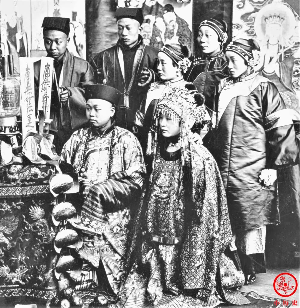 传统婚礼上都有拜天地的仪式,有些地方还有祭拜祖先的习俗,新人面向祖先牌位磕头。看照片里的阵势,这是一个大户人家,专门请了道士主持祭祖程序。如此一来,仪式严肃而繁琐,包括上香、读祝文、献胙、献帛、献酒、焚祝文、叩拜等等环节。