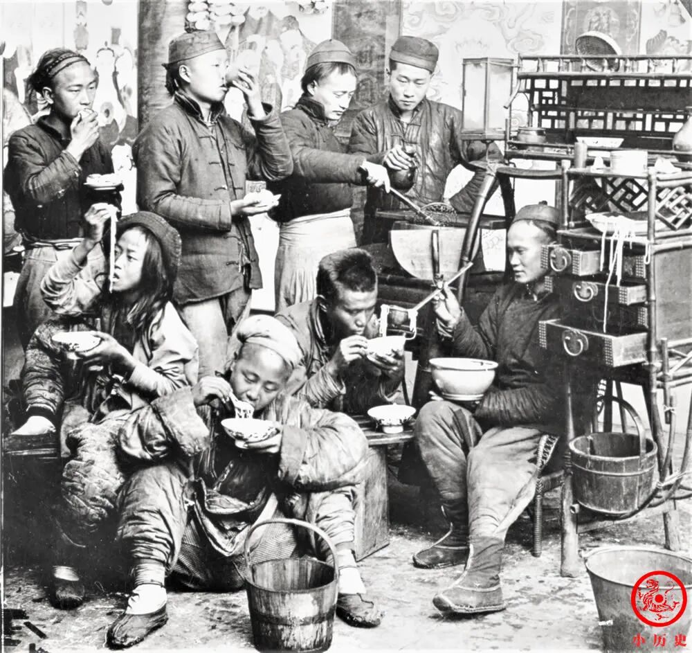 有经济实力的人吃早茶,做苦力的能吃饱就不错了。这些人挤在一个角落吃饭,动作夸张,照片疑似摆拍。