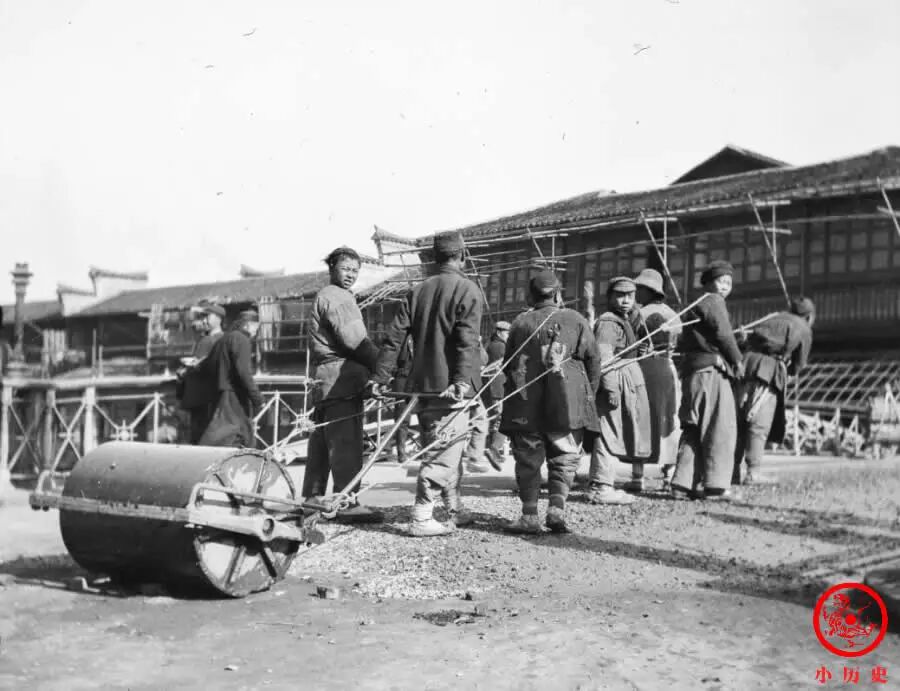 工人们合力拉着一块铁铸的碾子碾压路面,使之平整。照片中的道路不是柏油路,也不是土路,很像是碎石路。
