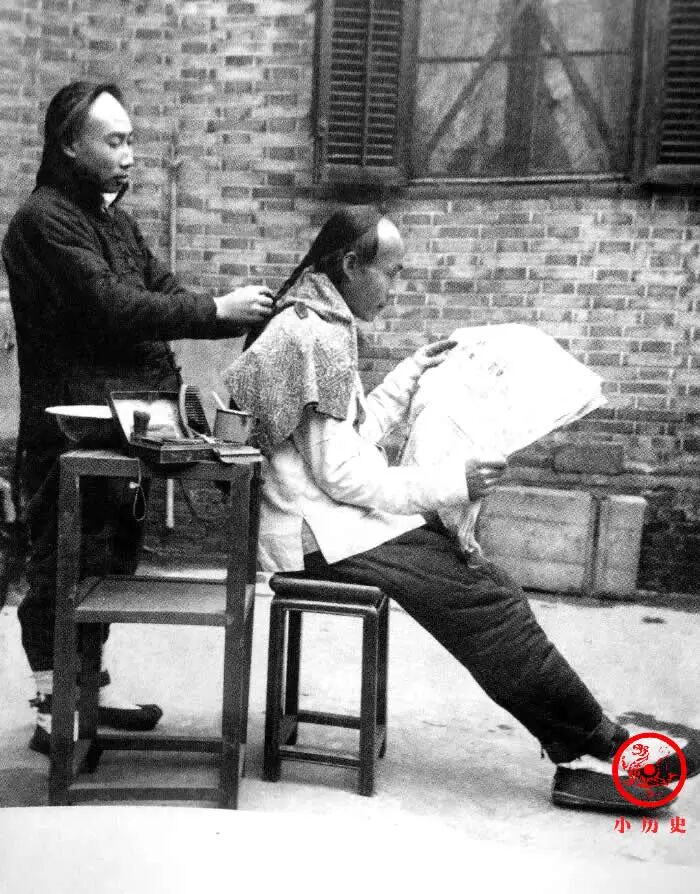 这是晚清世俗生活中很常见的一幕。男子要经常剃额头,通常在剃头这一天才洗一次头发,这其间已相隔十天半月,所以很多记录说清朝男人的发辫有很重的臭味,其实并不奇怪。顾客在看报纸,显示当时报刊已飞入寻常百姓家。