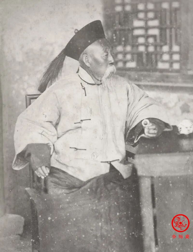 这位官吏侧对镜头,恰好露出他头上的顶戴花翎。顶戴就是官员戴的帽顶,按规定每个官员都有,根据品级其材质和色彩不同。花翎就不一样了,是皇帝赏赐给个别有功人员的,并不是每个官吏都有,能在官帽上插上花翎,那是莫大的荣耀。