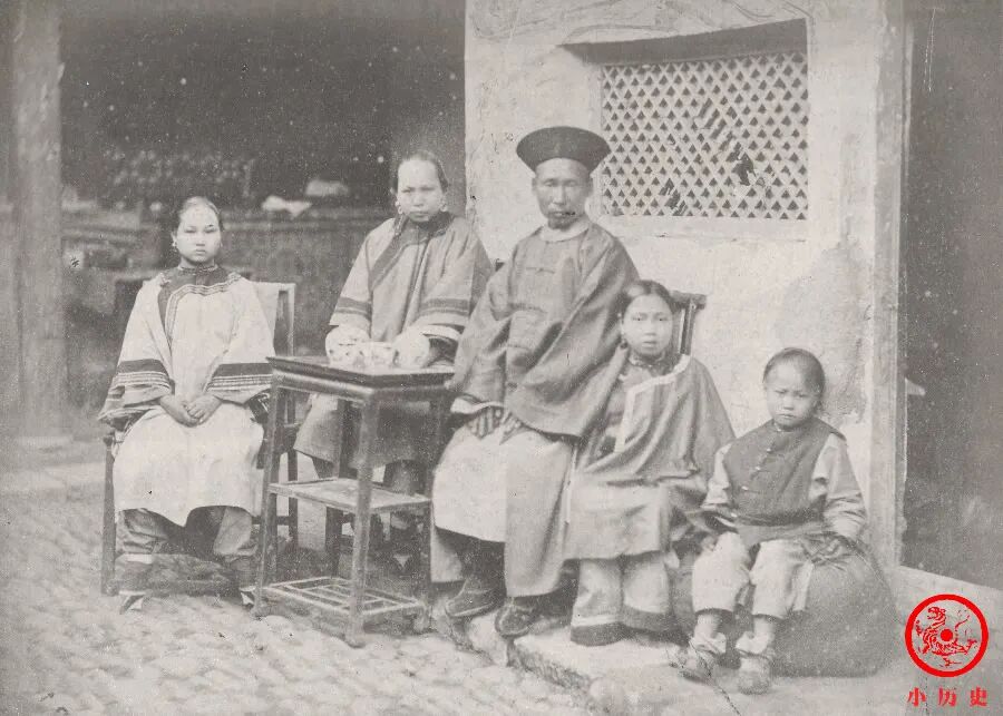 这位官吏与上一位形成鲜明对比,他没有恪守那些礼教教条,允许自己的妻子和女儿一起走到摄影师面前,拍摄了这一张“全家福”。当然,他也没有超脱他所处的时代,依然为女儿缠了“三寸金莲”。