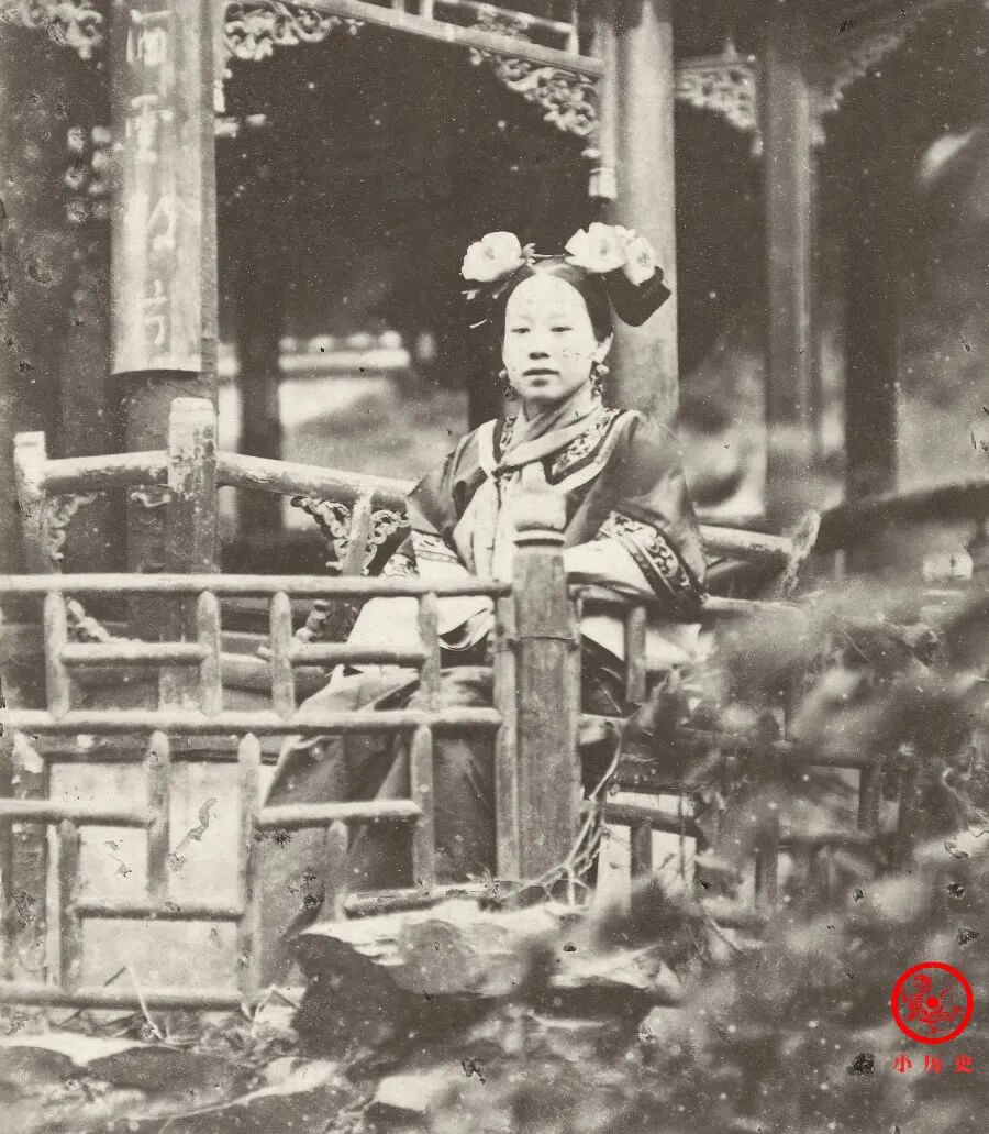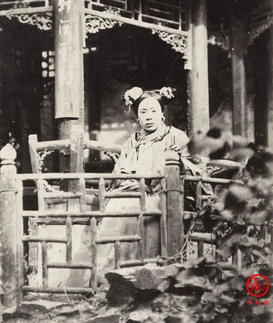 这位女子是北京富贵人士严先生(Mr. Yan,音译严,也可能姓颜、阎等)的妻妾之一,她坐在自家花园里拍摄了这张照片。