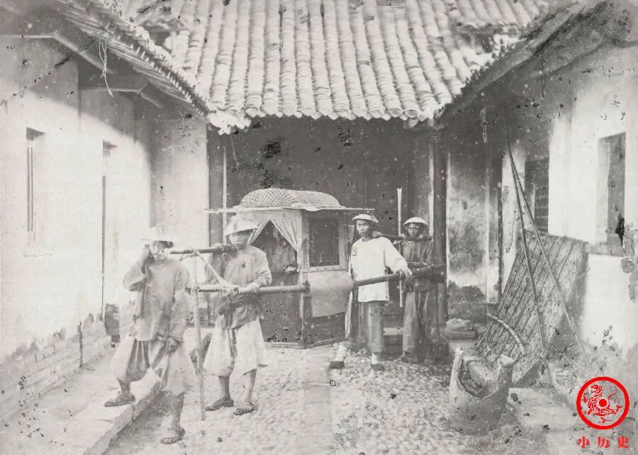 我们隐约能看到轿子内坐着一个男人。四名轿夫均戴凉帽,他们抬的应该是官轿。清朝官轿很特殊,官府并不承担购置轿子、雇佣轿夫的经费,其中的花销由官吏个人承担。当然,你能想象,这笔钱最终还是出在老百姓身上。