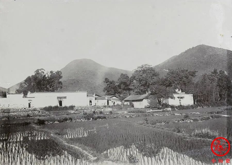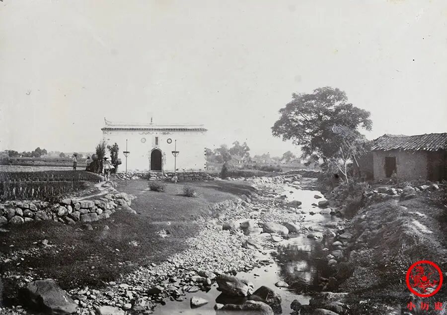 当时农民生活比较贫苦,但农村青山绿水的环境是有的。一条小溪潺潺流过,为这张照片增添了几分画意。左侧房屋是一座小庙。