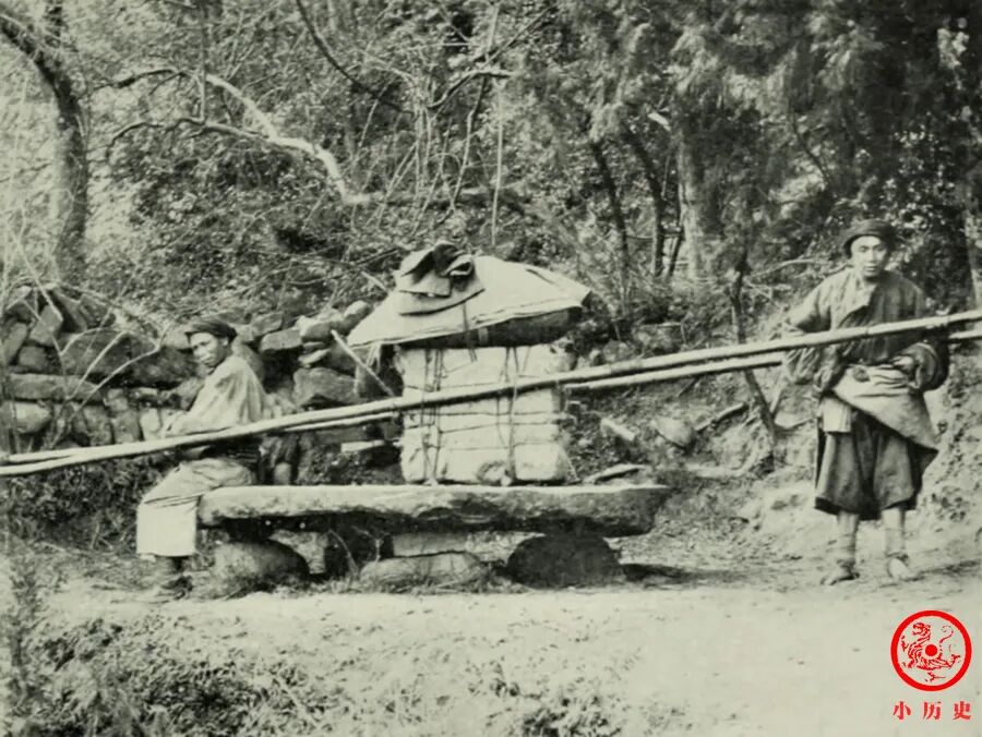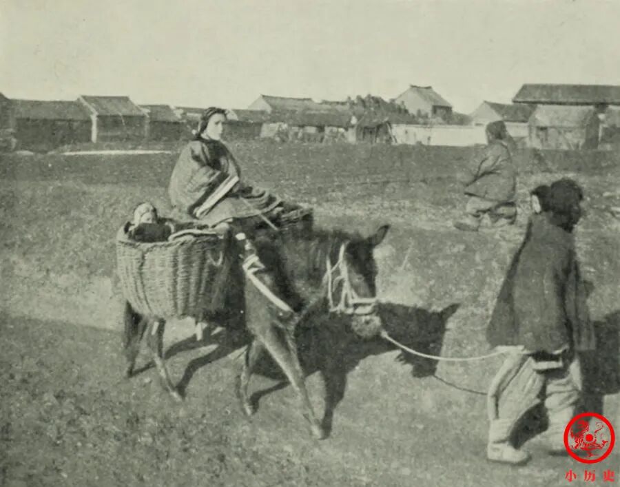 清朝妇女裹小脚现场非常普遍,她们出门必须借助交通工具,家庭富裕的坐轿子,出身平民之家的坐骡车,或骑骡子、骑驴。照片中的妇女骑在骡子上,筐里还放着孩子,可能是回娘家。