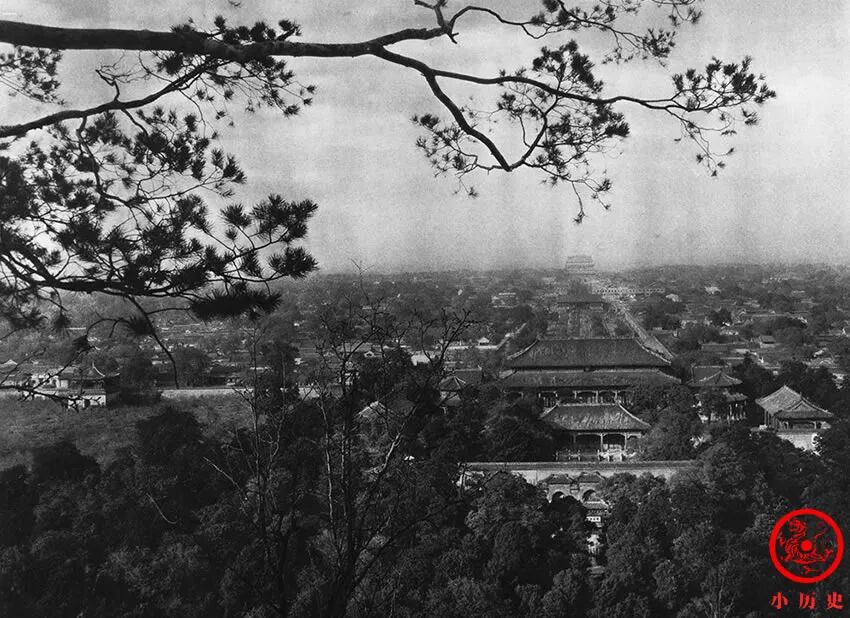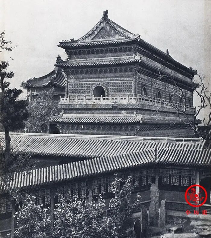 画面所及,是北京南北中轴线上的一段,能清晰地看到地安门和鼓楼。地安门东西两侧本有皇城墙,1913年已被拆除。