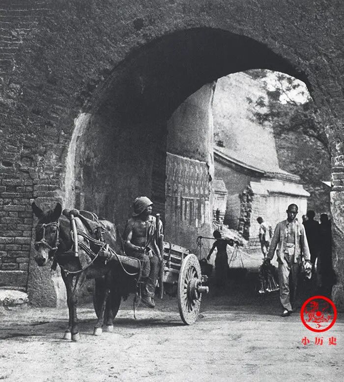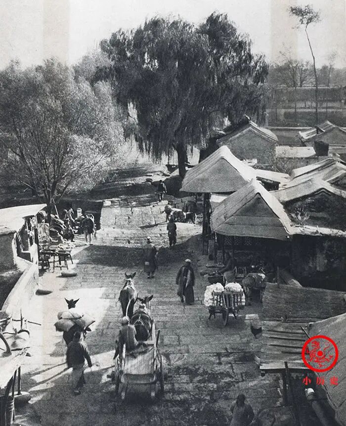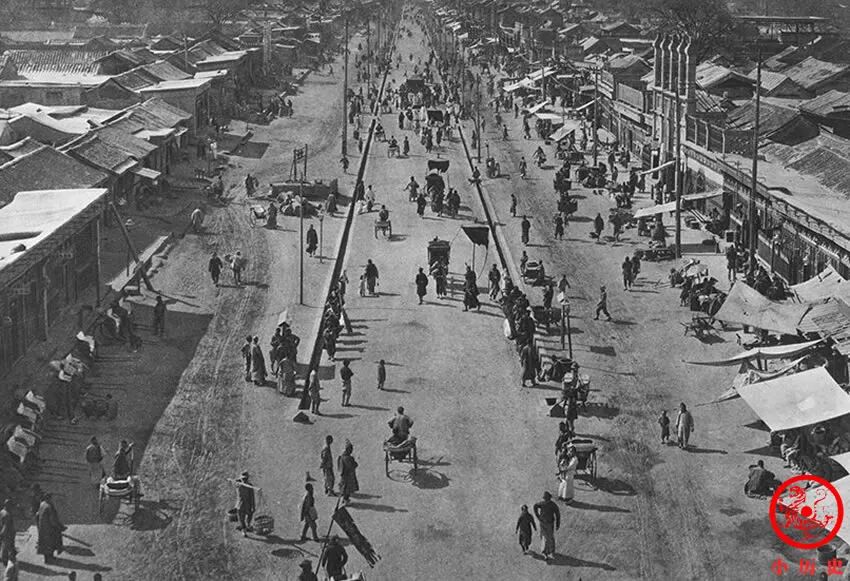 这张照片可能是站在安定门城楼上拍摄的。安定门大街是一条内城通向北方的大道,沿此路可达地坛,明清皇帝祭地之时必然要由此经过,故又俗称御路。民国时期这条路没有了皇帝通行,依然很热闹,路两边店铺林立。