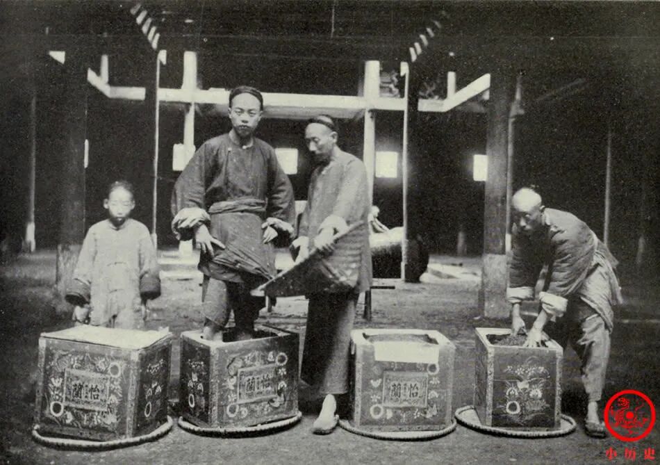 这一幕发生在名为怡兰的商行里。一个工人为了把茶叶压紧实,竟然跳进箱子直接用脚踩,卫生条件令人担忧。晚清时期茶叶向欧美的出口,遭到来自日本、印度的竞争,一大原因就是传统的制茶方式遭受诟病。