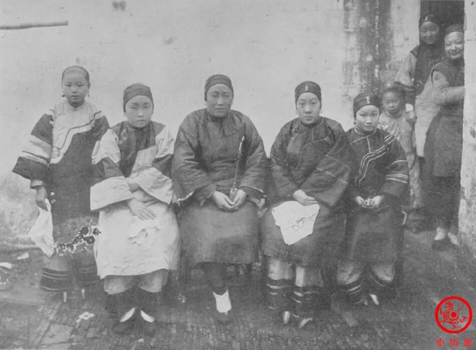 坐着的4位女子着装非常相似,都是头戴抹额、身穿袄裤,也许当时女性服饰较为单调,算不上争奇斗艳。她们当中有人天足,有人裹小脚,可见清朝裹脚之风虽然严重,但也不能一概而论。