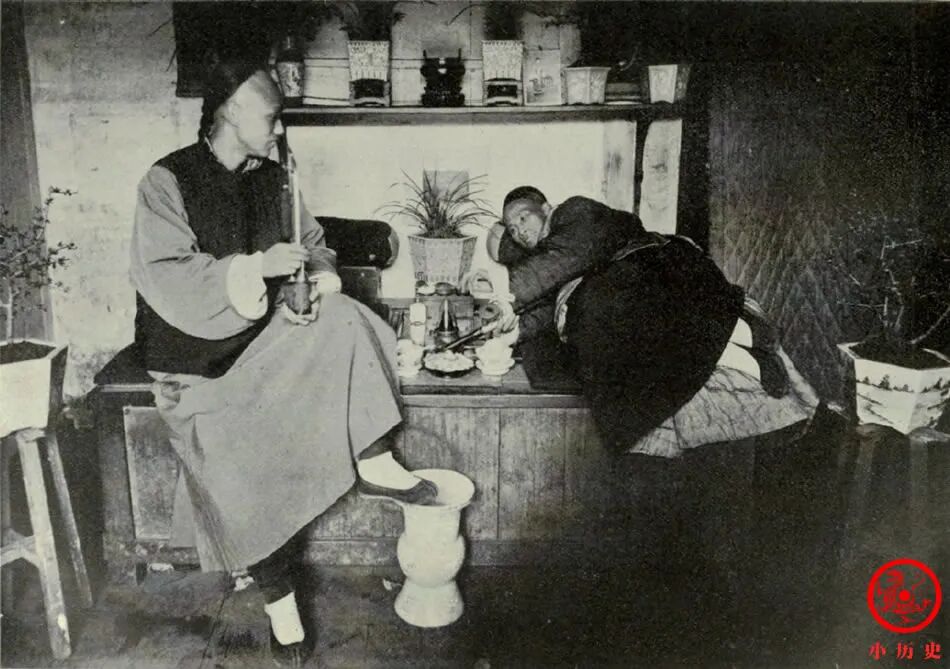 左边的男人吸水烟,右边的吸鸦片烟,他面前摆着一整套吸食工具。