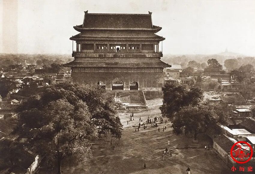 鼓楼就是早晚敲鼓向百姓报时的建筑,与钟楼相配合,约略等于一座大闹钟。击钟、鼓时先快击十八响,再慢击十八响,快慢相间计六次,共一百零八响。在这张照片中我们隐约可见二楼大门内的主鼓,它周围有群鼓二十四面。