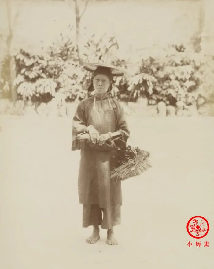 这一位天足的妇女,在清朝裹脚成风的社会环境下,算是少数派。正是因为没裹脚,她才可以自如地赤脚行走。如果是小脚,她要穿上弓鞋,并且行走困难,只能过“大门不出二门不迈”的生活。