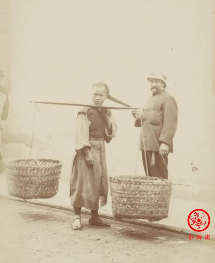 外国巡捕拽着挑扁担小商贩的发辫拍照,此举显然带有侮辱挑衅的意味。这个场景应该是摄影师与巡捕合谋导演出来的,小商贩处于弱势地位,根本无力反抗,只好默默配合。