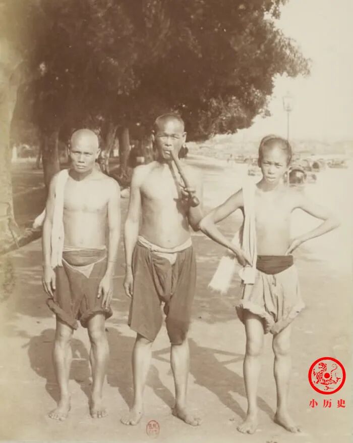 他们赤膊、赤脚,还很瘦,显示着普通劳动者的身份。那时候打赤脚的人很多,不是因为广东天气热,而是实在没有多余的钱买鞋子,能省就省。